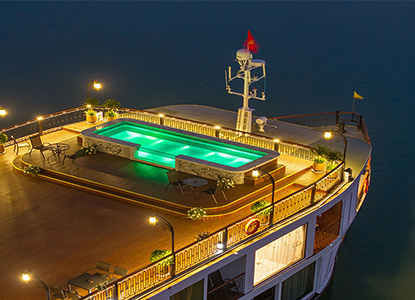Indochine Grand Cruise has basic amenities such as gourmet restaurant, sky bar, infinity deck, lounge, and massage area, Indochine Grand introduces two distinctive highlights: A mini golf course for active relaxation and a jacuzzi pool for serene (mini swimming pool), immersive moments surrounded by the bay's breathtaking beauty.